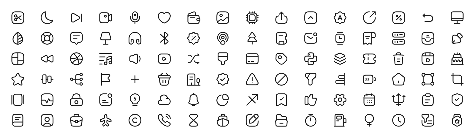 A comprehensive set of UI icons covering essential product needs including navigation, actions, content, forms, system states, finance, media, devices, and more.